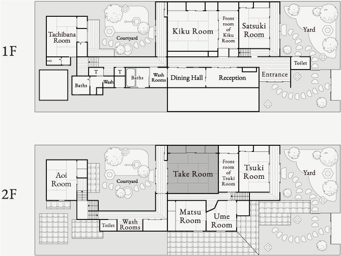 We have two baths, a wooden-style and a western-style. The wooden-style bath is made using Japanese umbrella-pine, a fragrant wood that is soft to the touch. Both baths are common rooms, which guests take turns to use.