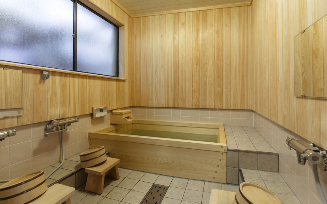 館内には「高野槙の風呂」と「ヒノキ風呂」の2つの共用風呂があります。木風呂には高野槙を使用しており、香りがよくお湯の肌触りもまろやかです。お部屋ごとに交代でご利用いただいております。