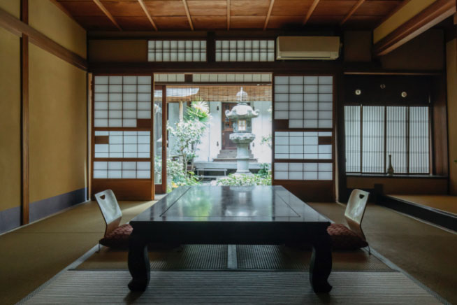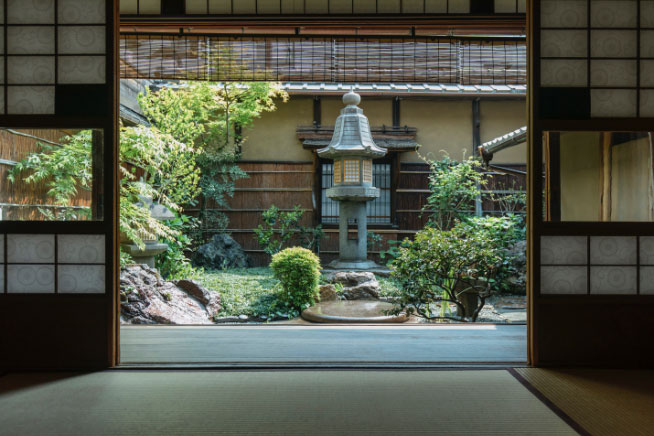 お部屋の廊下からは⼟蔵と中庭が眺められます。